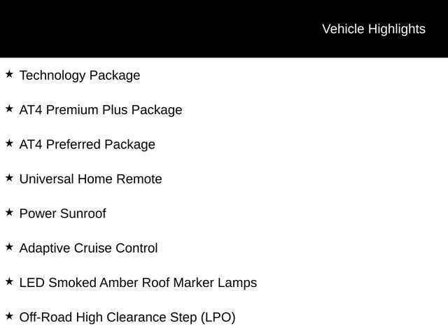 Elevating your driving experience, the AT4 Premium Plus Package equips this Sierra with a Power Sunroof, Technology Package, and Off-Road High Clearance Step. Enjoy the convenience of Adaptive Cruise Control, Universal Home Remote, and the stunning Multicolor 15 Diagonal Head-Up Display.